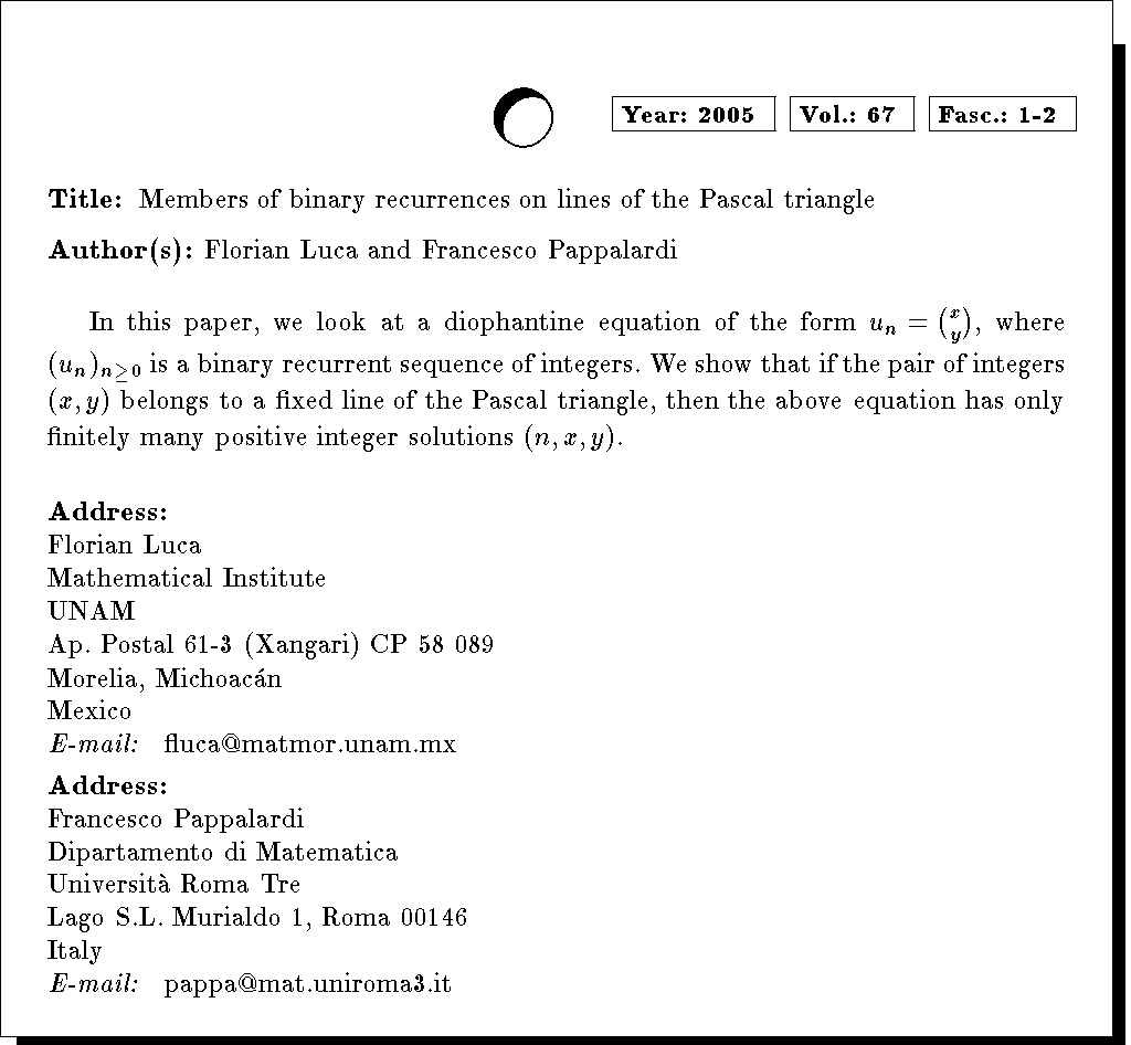 Keywords: binary recurrences, binomial coefficients