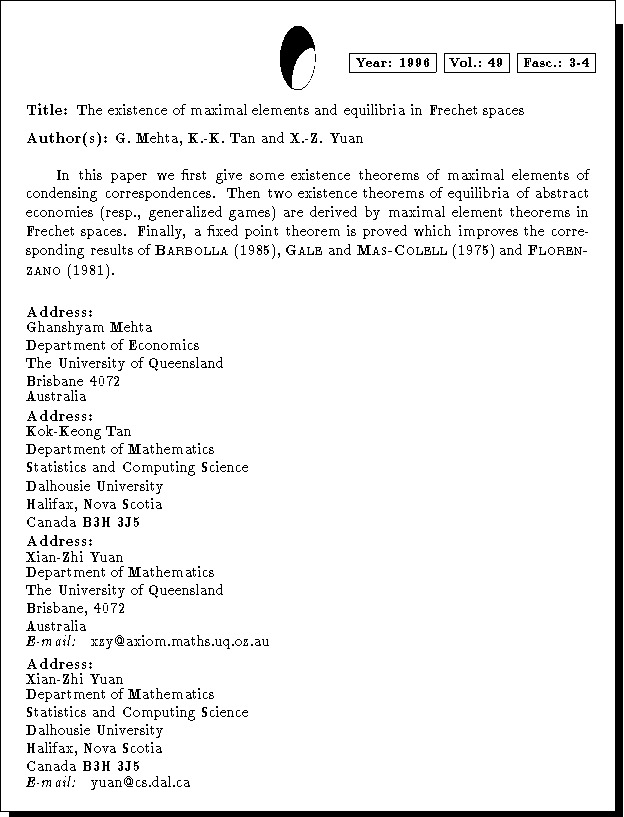 Keywords: Condensing mappings, Lower semicontinuous, upper semicontinuous, fixed point, maximal element, selection theorem, equilibrium point, abstract economy, generalized game, Frechet space