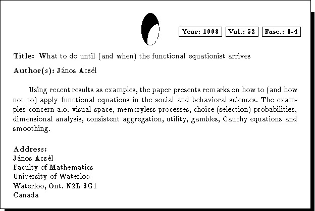 Keywords: functional equations, Cauchy equations, domain of equation, codomain, injectivity, differentiable, locally integrable, smoothing, psychophysics, visual space, memoryless, choice probability, dimensional analysis, consistent aggregation, production functions, compatibility, representativity, gambles, additivity, separability