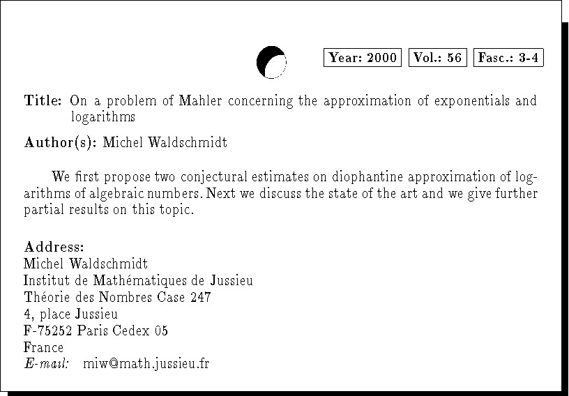 Keywords: exponential function, logarithms of algebraic numbers, Mahler, diophantine approximation