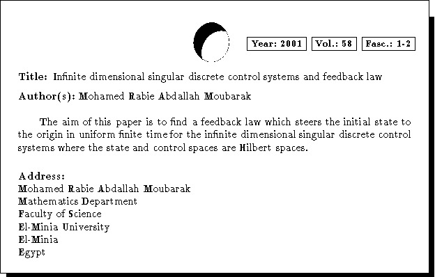 Keywords: infinite dimensional singular discrete control systems, feedback law