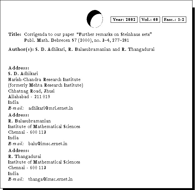 Corrigenda to our paper: ''Further remarks on Steinhaus sets'', Publ. Math. Debrecen, 57/3-4 (2000), 277-281