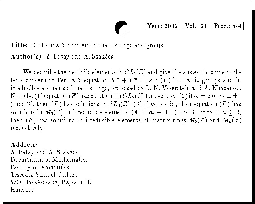 Keywords: Fermat equation, irreducible element, matrix equations, groups, rings