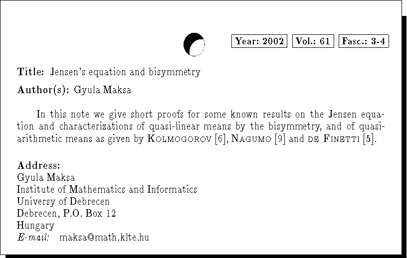 Keywords: Jensen's equation, bisymmetry, quasi-linear means, quasi-arithmetic means