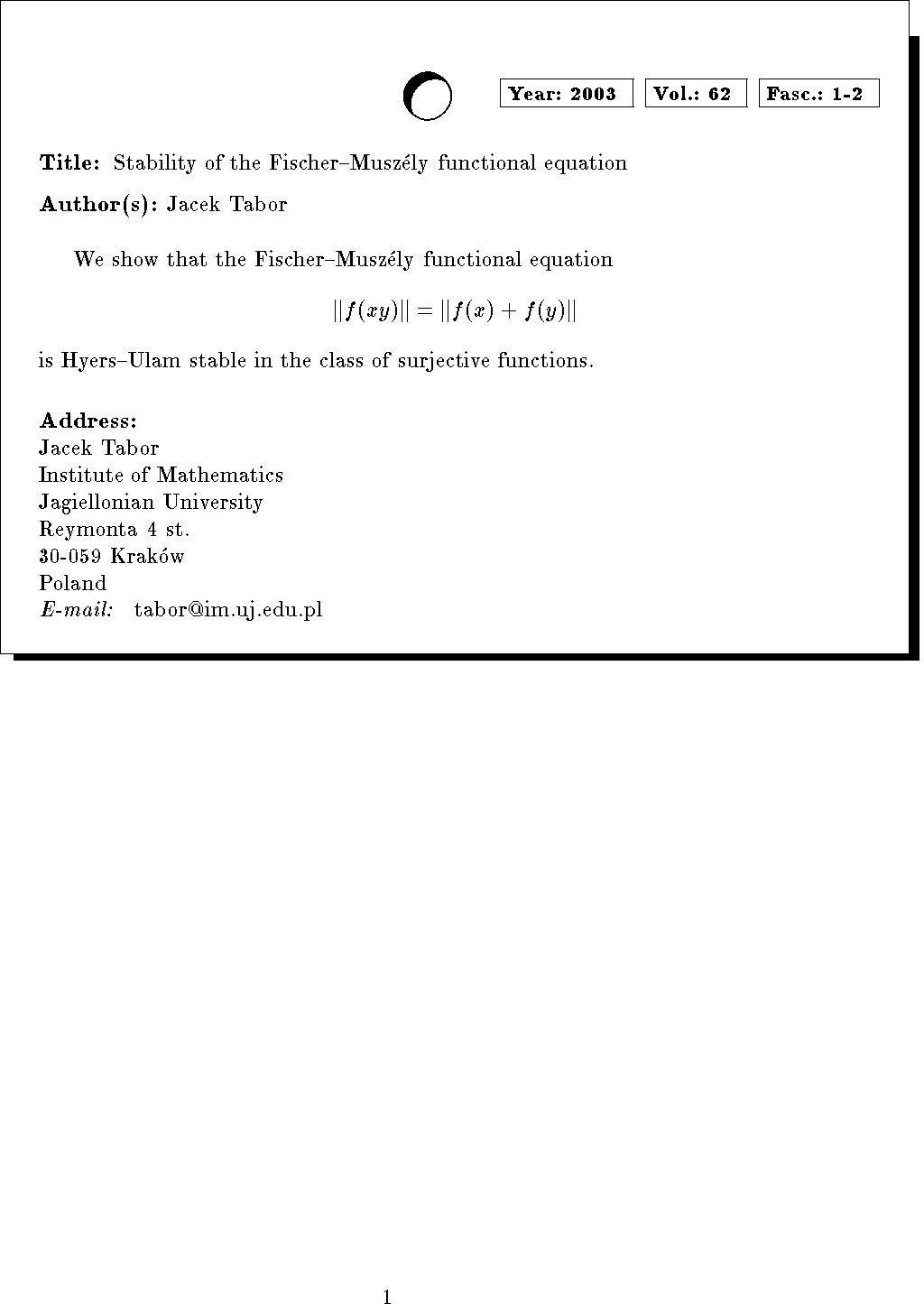Mathematics Subject Classification: 39B52, 39B82