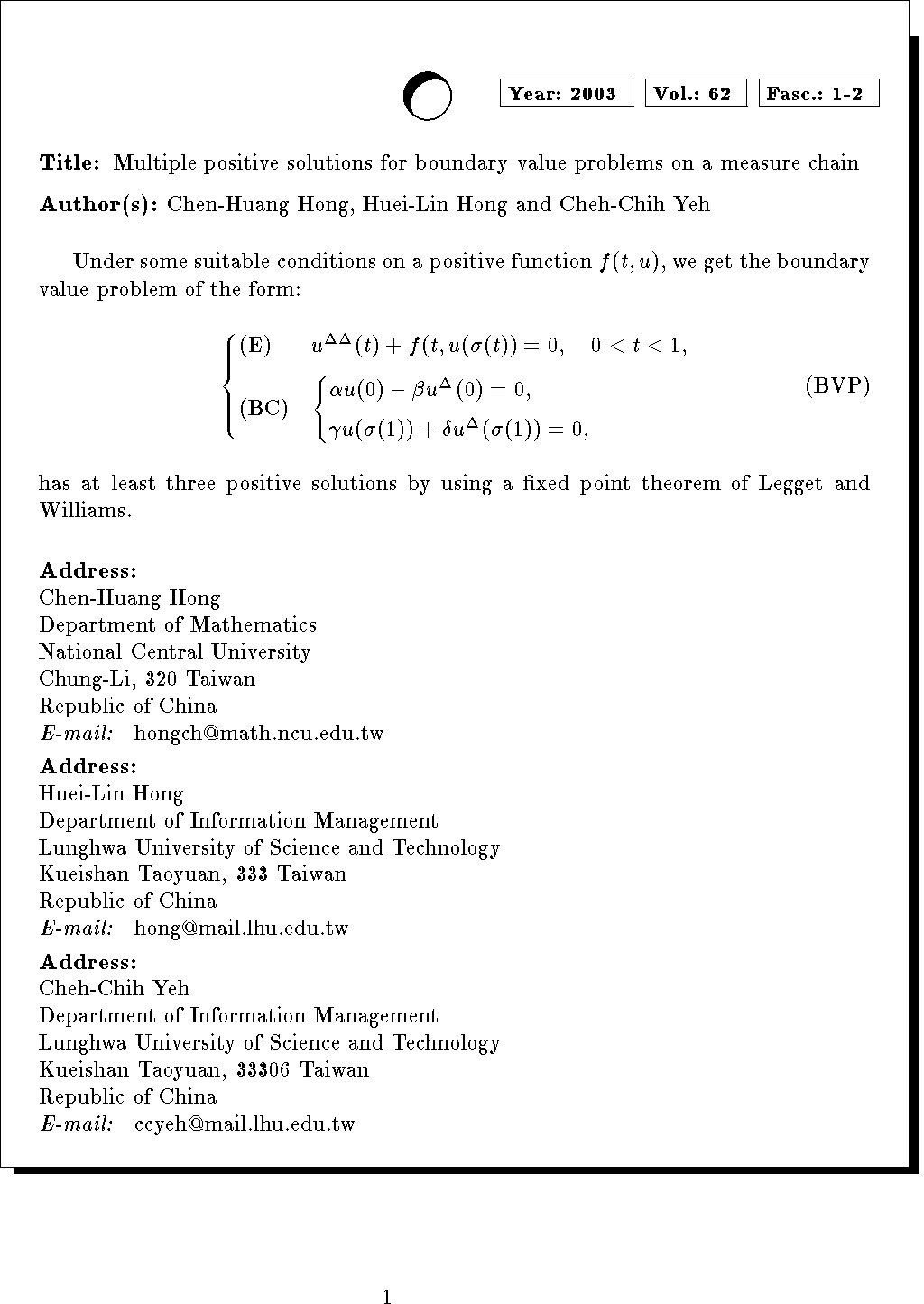 Keywords: three positive solutions, measure chain, concave function, Green's function, cone, fixed point
