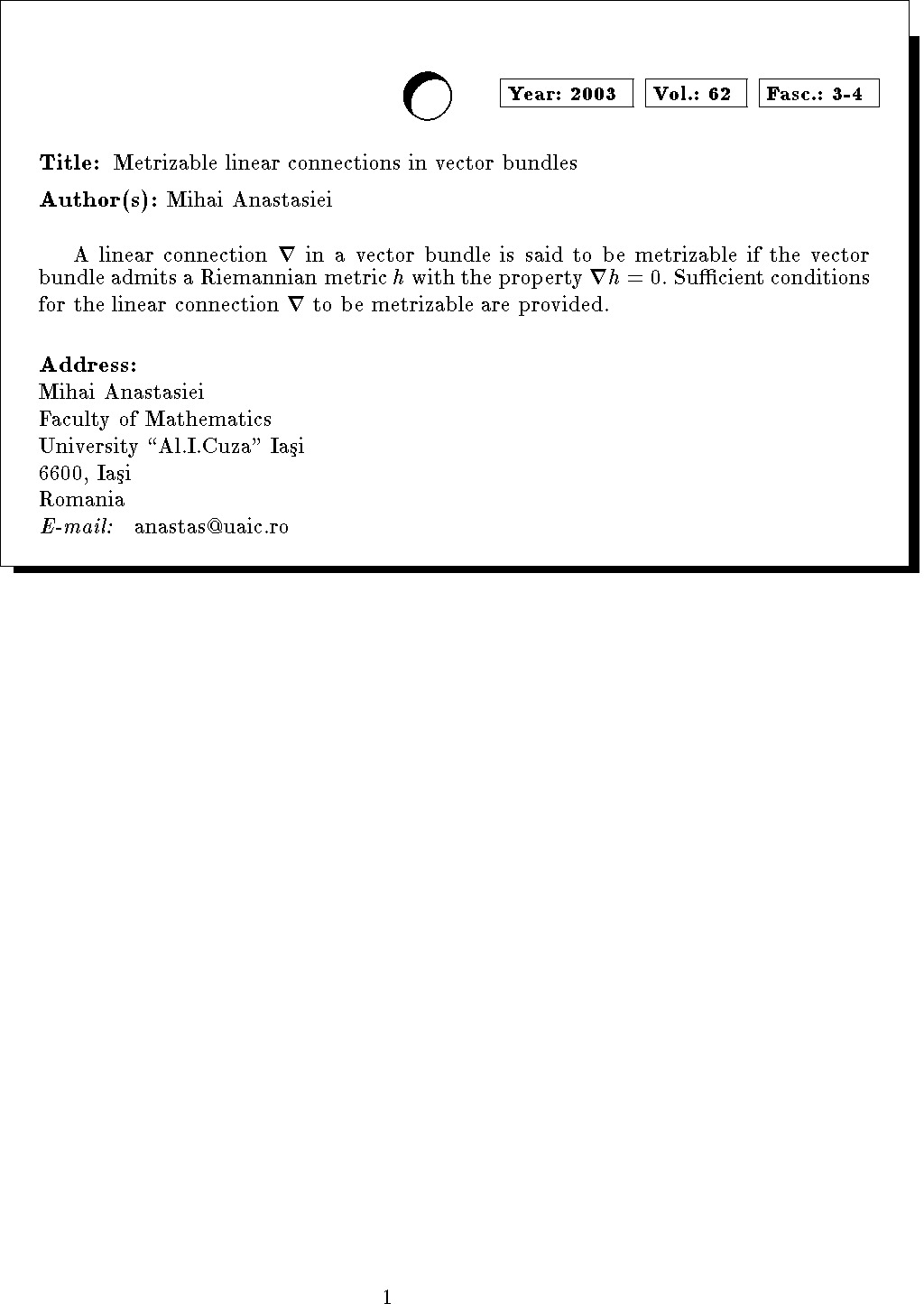 Keywords: vector bundles, linear connections, metrizability