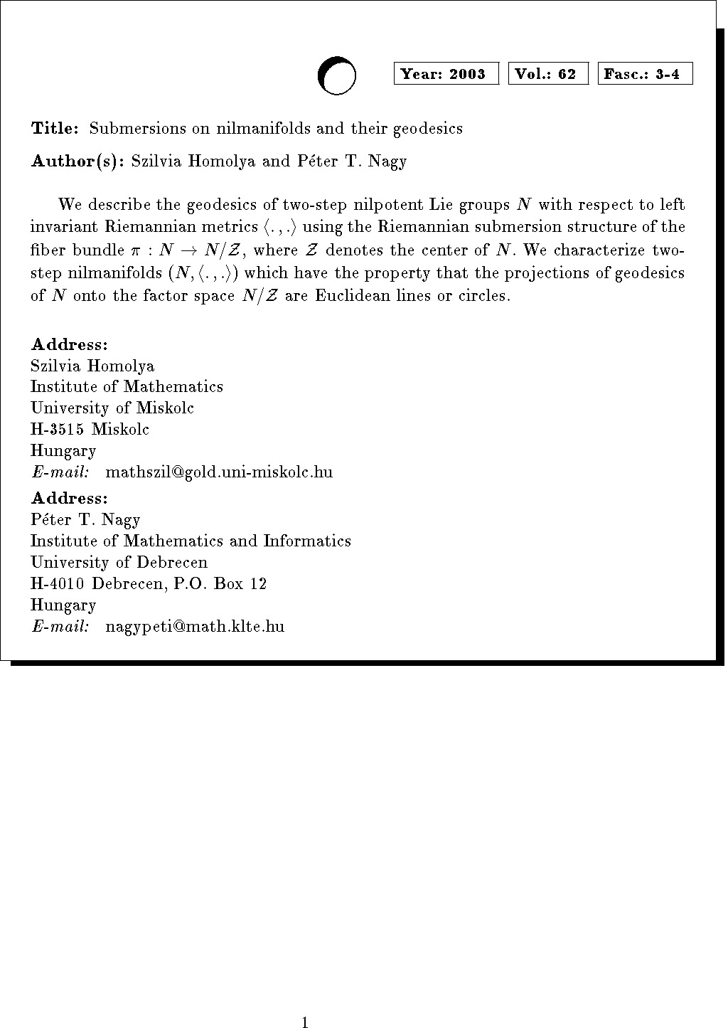 Keywords: nilmanifolds, two-step nilpotent Lie groups, H-type groups, Riemannian submersion