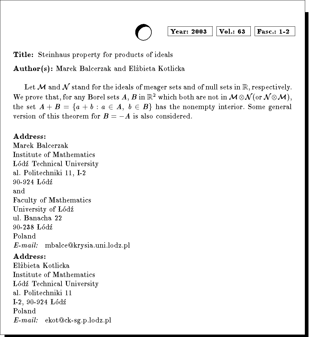 Keywords: Steinhaus property, ideal of sets, product of ideals, additive function