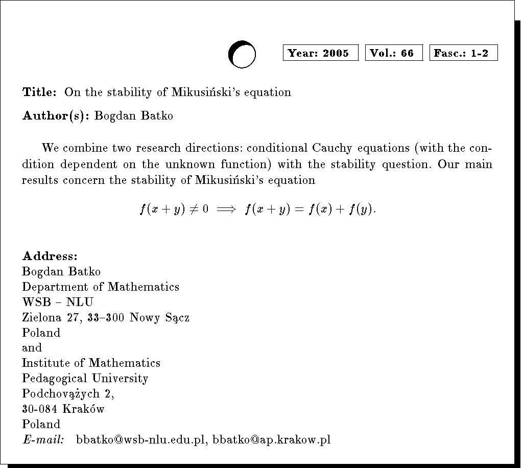 Keywords: stability, conditional Cauchy equation, Mikusiński's equation